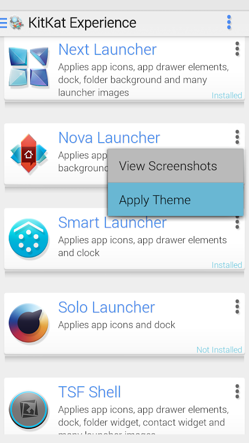 KitKat 4.4 Launcher Theme adalah sekumpulan Tema-tema cantik terinspirasi dari OS android Generasi Keempat yang akan datang (masih jarang) yakni KitKat 4.4 yang Kompatibel (cocok) untuk seluruh Launcher, Minimal OS yang digunakan adalah ICS (ice cream sanwitch) 4.0. dengan KitKat 4.4 Launcher Theme maka tampilan android anda sangat menyerupai Android KitKat 4.4 tanpa ada perbedaan, dimulai dari Custom-design Icon, Dock bar, Wallpaper, Folder, Widget dan masih banyak lagi, plus support full fitur Graphic Nova Launcher, Smart Launcher, Apex Launcher, TSF Shell, Next Launcher 3D, GO Launcher EX, ADW Launcher, ADWLauncher EX, Holo Launcher, SS Launcher, Solo Launcher, Atom Launcher, Dll. Ingin Mencobanya..? Yang baru versi 2.1