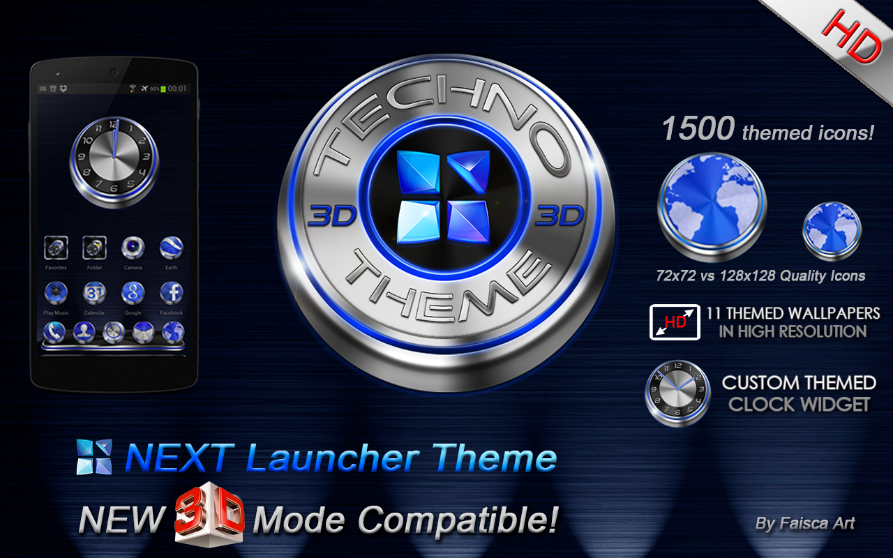Ini adalah Tambahan Tema pada Next Launcher 3D. Bawaan Aplikasi Next Launcher 3D, rata-rata hanya ada 2 Teman bawaan, type Klasik dan Beta, untuk menambahkannya kita harus mendownloadnya, dan juga berbayar. Sekarang hadir Tema Keren untuk Next Launcher yakni Next Launcher Theme Techno 3D, yang sudah termasuk didalamnya 11 tema berkualitas High / tinggi, dan juga tambahan jenis icon 128x128 yang jumlahnya ada 1500 pack. so.... dengan tambahan Next Launcher Theme Techno 3D pada launcher Next 3D di perangkat android anda, menambah serta melengkapi gaya dan mempercantik tampilan perangkat android anda.< div>